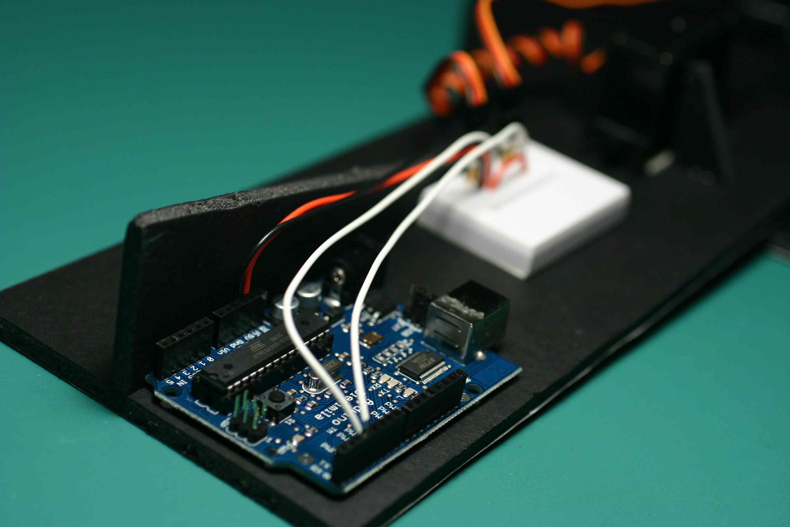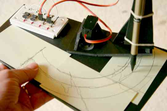 Our friends at DorkbotPdx have gotten us interested in the open-source ArduinoBoard. This 15-inch tall animated stand-up cut-out is our first work, called MiniRay. It uses a single Arduino in place of a handful of Cybords.